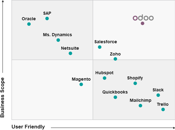 Odoo es un completo software de gestión empresarial (ERP) de aplicaciones modulares que cubren todo tipo de necesidades empresariales para las diferentes áreas: Contabilidad, Finanzas, Ventas, RRHH, Compras, Proyectos, Almacenes (SGA), CRM, Fabricación, Sistema de Gestión de Contenido (CMS), sistema de comercio electrónico flexible y extensible, Punto de Venta, Eventos, Blogs, Boletines, Marketing, Sitios Web, Help Desk entre otras.